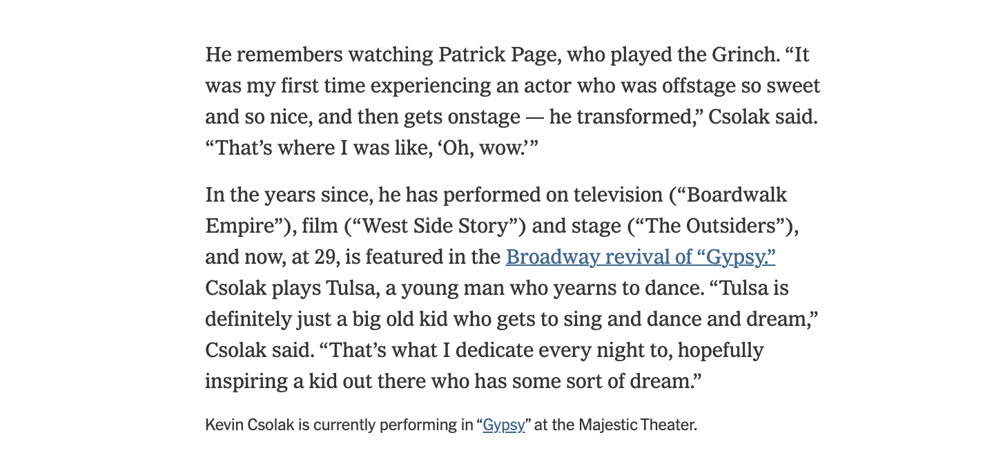 This month, The Ensemblist named Csolak on their “Ones to Watch” list for 2018. “Earlier this month, we celebrated some of Broadway’s most venerated ensemble actors with the 5th Annual Ensemblist Awards,” says The Ensemblist creator Mo Brady. “However, we wanted to find a way to celebrate and champion the exciting new talent hitting Broadway stages this year as well. That’s how our new ‘Ones to Watch’ list was born.”